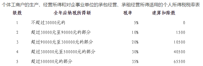 对纳税人取得的个体工商户的生产、经营所得和对企事业单位的承包经营、承租经营所得,按5000元/月的基本减除费用进行扣除,同时适用新的经营所得税率表: